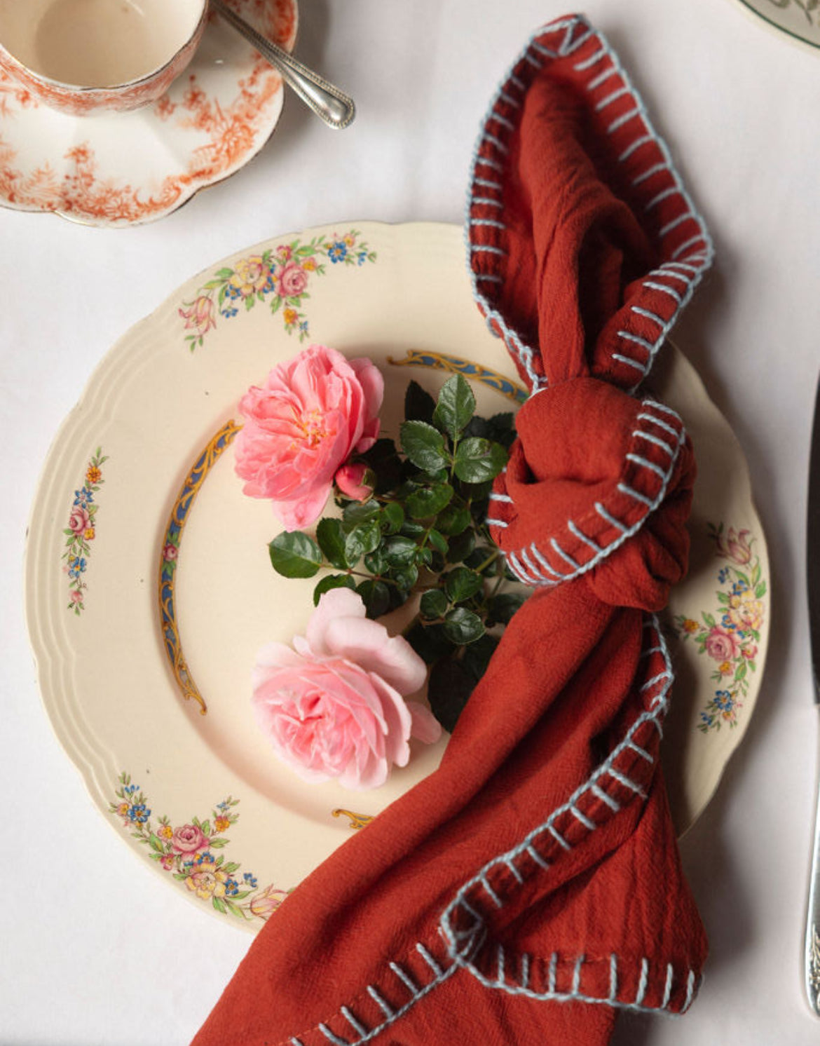 Elevate your dining experience with our beautifully crafted cotton and linen blend napkins. Each piece is adorned with delicate hand embroidery, offering a unique and personal touch that adds charm to any table setting. The versatile colour palette complements a wide range of interior styles. Choose our classic ecru square napkins with a farm style red blanket stitch or opt for elongated coloured versions-perfect for creative table displays. Made from a durable and easy-care cotton-linen blend, these napkins are designed for both everyday elegance and long-lasting use.