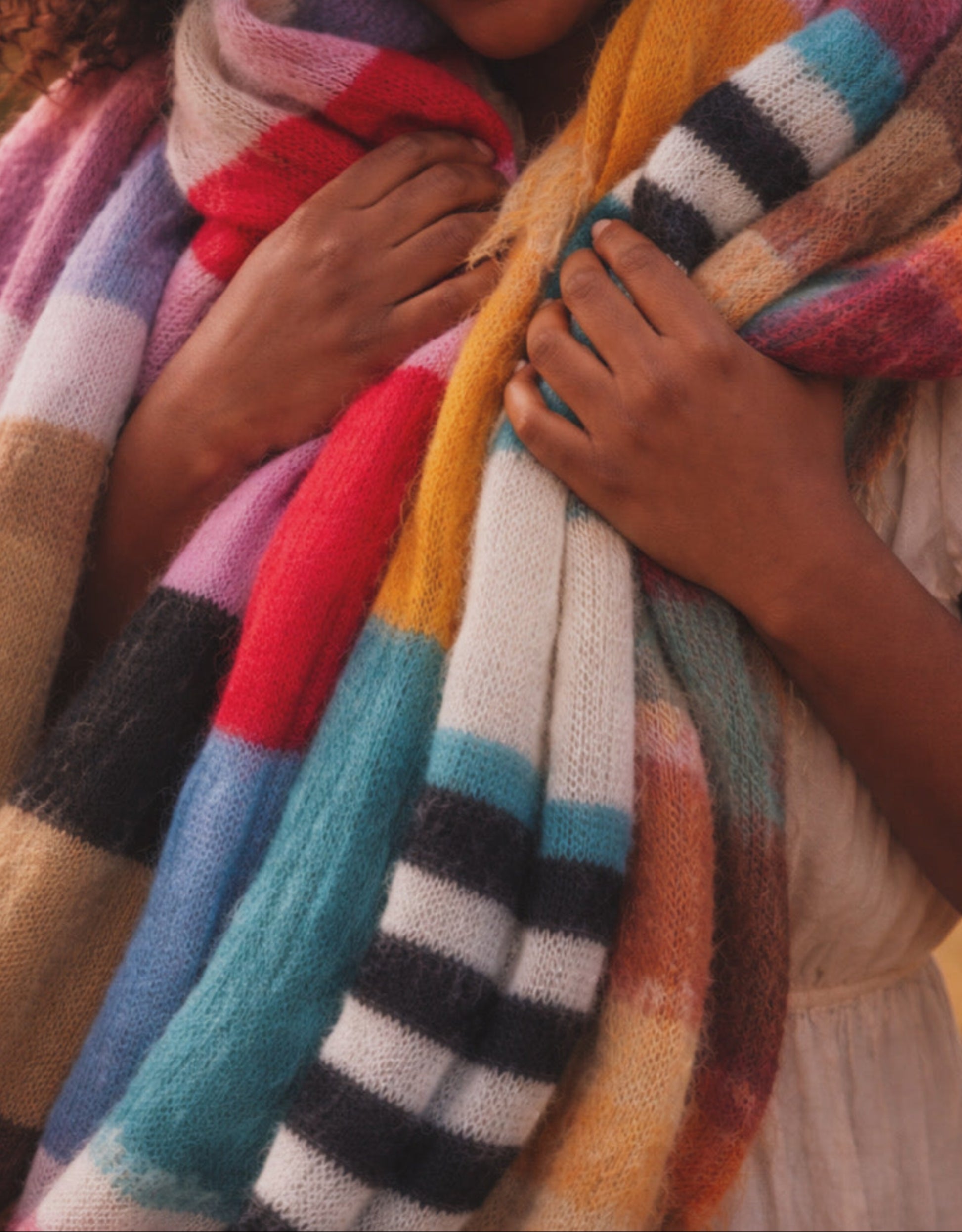 Our Superkid Mohair and silk scarves are a celebration of creativity and colour, bringing a refined, premium touch to any outfit . Each scarf is one of a kind, designed and hand-knitted by skilled women in our community.